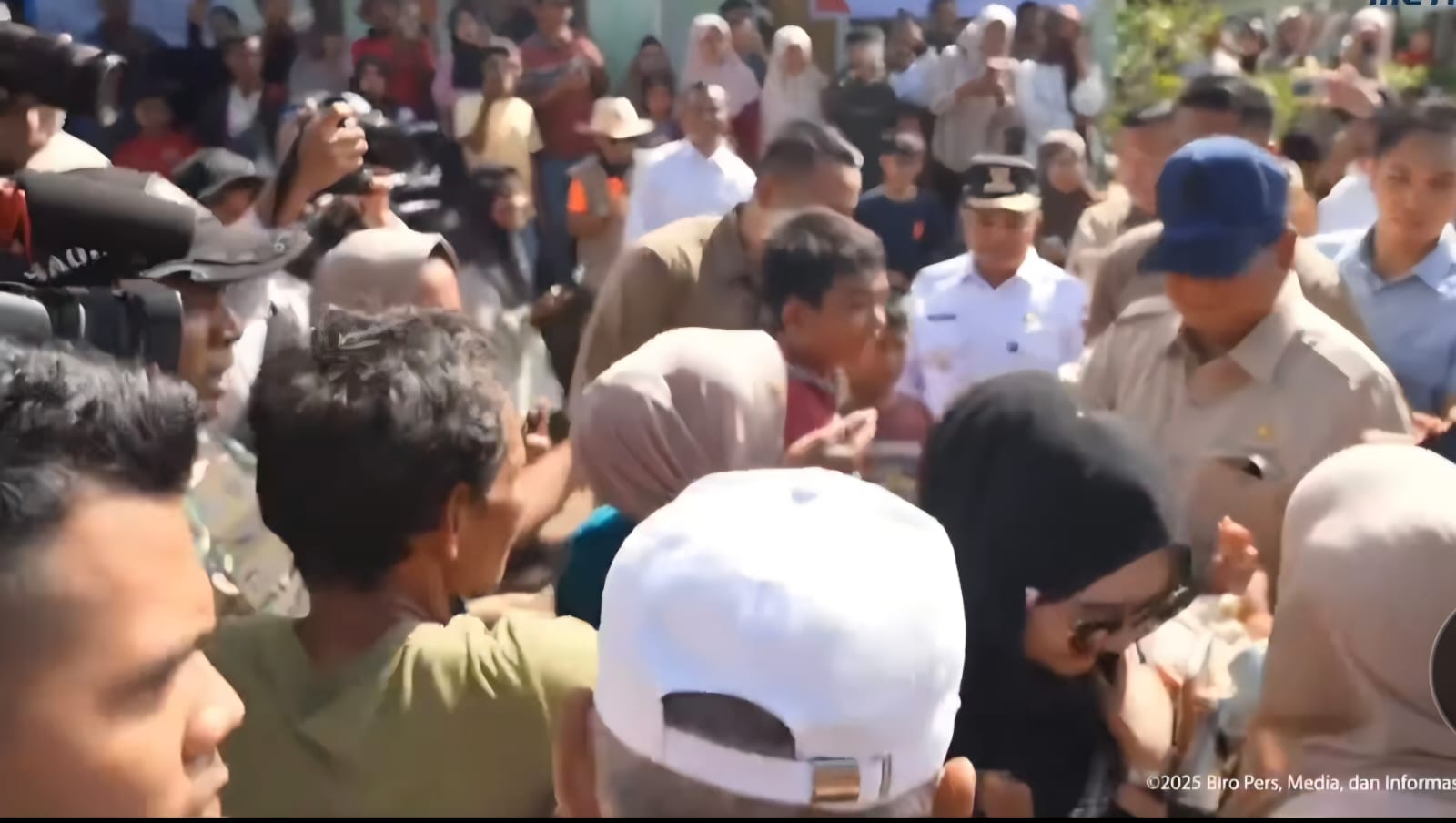 Presiden yang mengenakan pakaian lapangan dengan topi dan kacamata hitam itu menyapa satu per satu anak-anak yang menghampirinya. “Kamu kelas berapa?” tanya Prabowo kepada seorang anak, disambut jawaban polos yang mengundang senyum warga di sekitar lokasi.