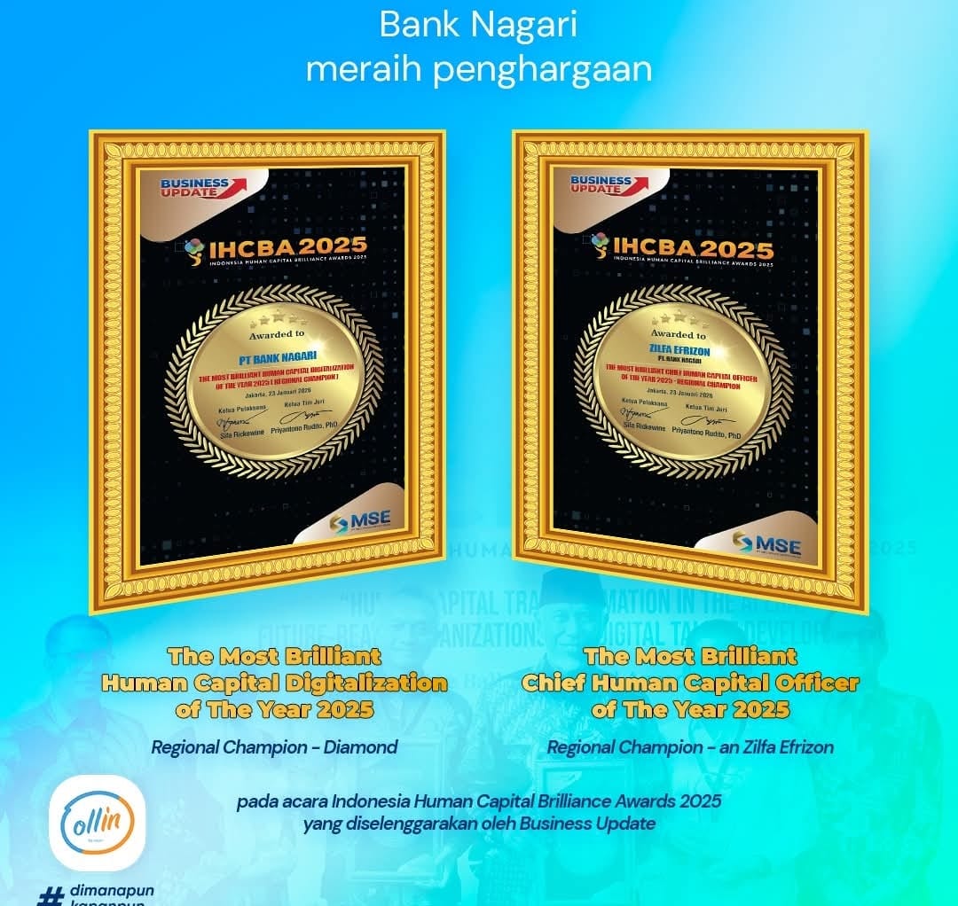 Tidak hanya bersinar di sektor bisnis dan kepemimpinan syariah, Bank Nagari juga kembali mencatatkan prestasi membanggakan di bidang transformasi Human Capital. Bank Nagari dianugerahi penghargaan “The Most Brilliant Human Capital Digitalization of The Year 2025 – Regional Champion” dengan Predikat Diamond, sebagai pengakuan atas inovasi dan digitalisasi pengelolaan sumber daya manusia yang berkelanjutan.