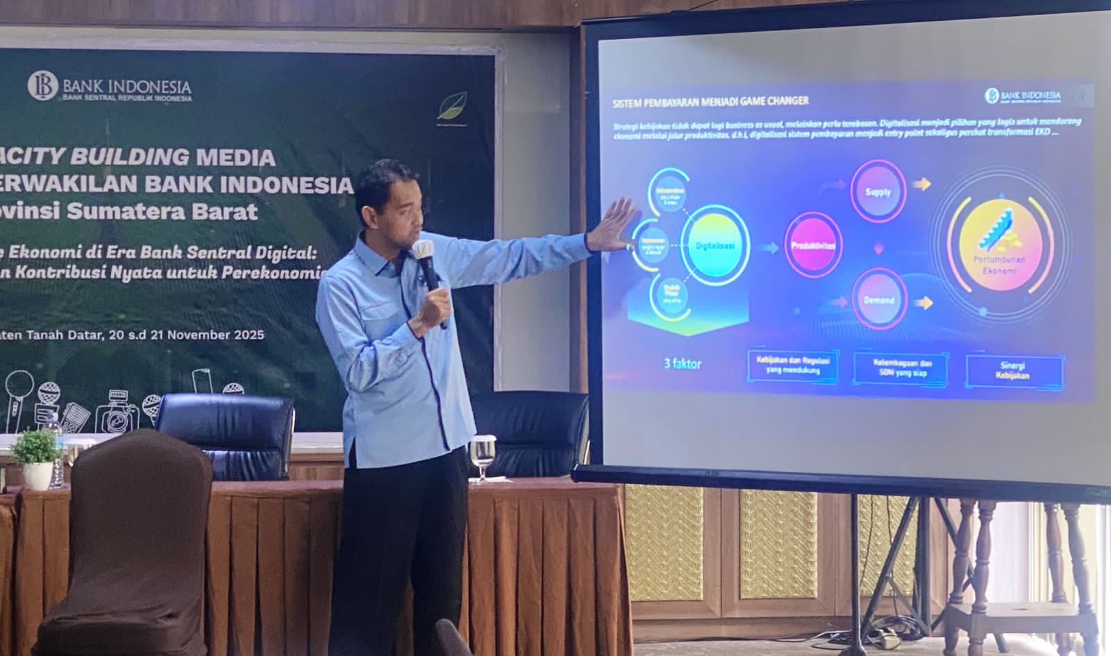 Bank Indonesia (BI) Provinsi Sumatera Barat (Sumbar) menegaskan bahwa transformasi sistem pembayaran digital telah menjadi salah satu fondasi penting dalam mendorong pertumbuhan ekonomi Indonesia. Hal itu disampaikan Deputi Direktur Kantor Perwakilan BI Sumbar Dandy Indarto Seno dalam Capacity Building Media, Rabu (20/11/2025), yang diikuti oleh puluhan wartawan Sumbar.