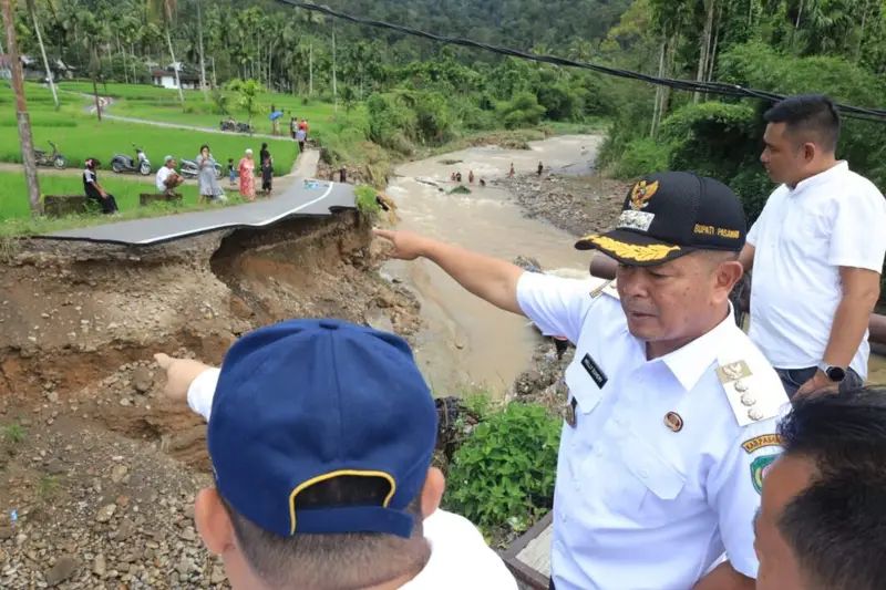 Bupati Pasaman Welly Suhery, bersama Wakil Bupati Parulian dan jajaran terkait, turun langsung meninjau sejumlah lokasi terdampak banjir bandang di Kecamatan Simpang Alahan Mati dan sekitarnya, Rabu (15/4/2026).