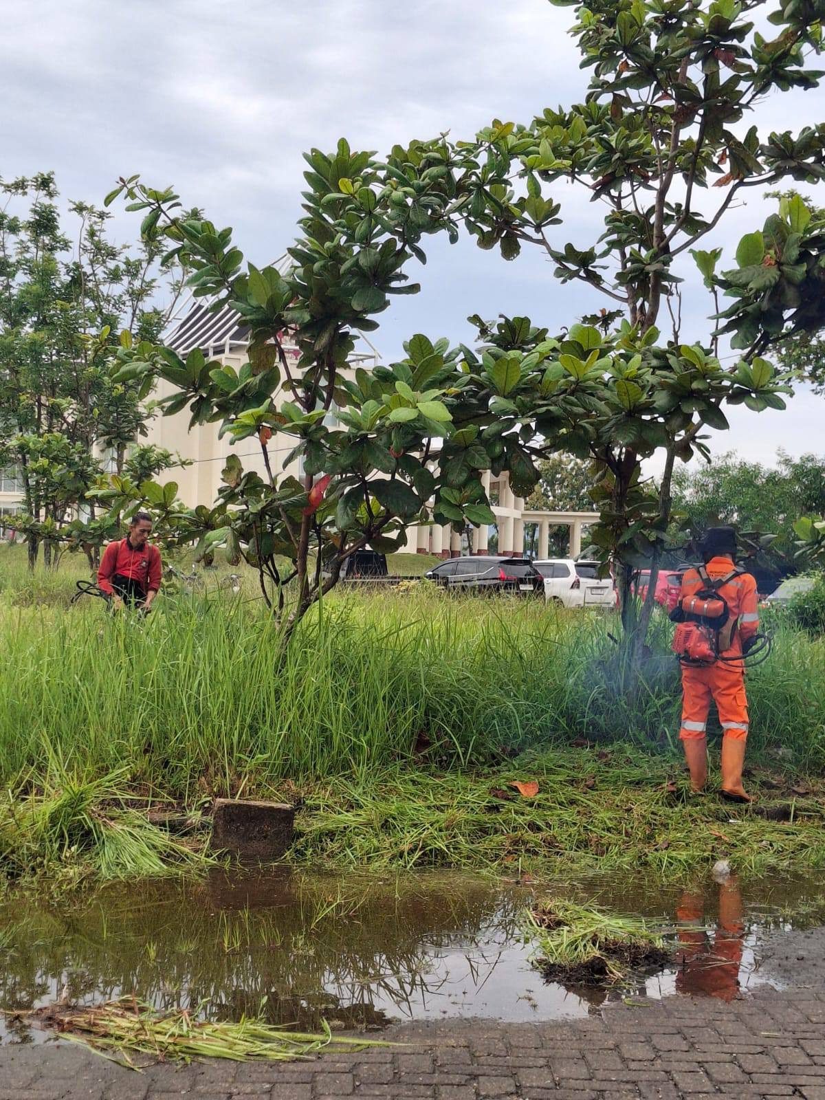 Selain pemotongan rumput, petugas juga melakukan pembersihan saluran drainase kecil serta pemapasan dahan pohon yang dinilai terlalu rimbun.
