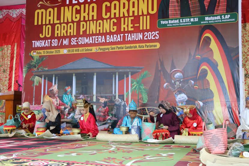 Festival Malingka Carano Jo Arai Pinang tingkat SD/MI se-Sumatera Barat kembali digelar untuk kedua kalinya. Festival ini diselenggarakan oleh Musyawarah Kerja Kepala Sekolah (MK3S) Kecamatan Pariaman Timur ini, berlangsung di Panggung Utama Pantai Gandoriah, Kota Pariaman, Rabu (15/10/2025).