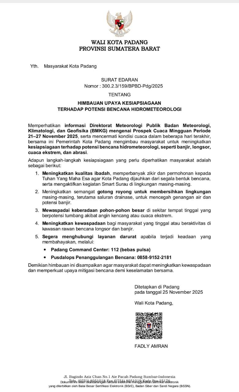 Wali Kota Padang Fadly Amran mengeluarkan Surat Edaran Nomor 300.2.3/159/BPBD-Pdg/2025 tentang Himbauan Upaya Kesiapsiagaan terhadap Potensi Bencana Hidrometeorologi, sebagai respons atas meningkatnya risiko banjir, longsor, cuaca ekstrem, dan abrasi yang melanda kota dalam sepekan terakhir.