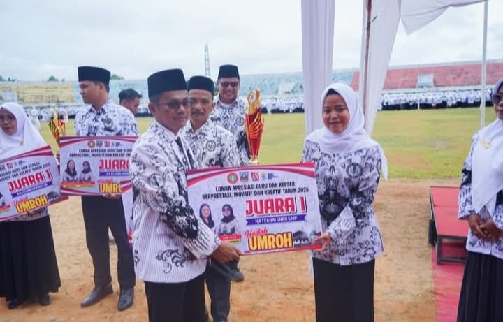 Suasana haru menyelimuti Stadion Sport Center Dharmasraya, Selasa (25/11/2025). Pada peringatan Hari Guru Nasional dan HUT ke-80 PGRI, Bupati Annisa Suci Ramadhani dan Wakil Bupati Leli Arni memberikan hadiah umrah kepada enam guru dan kepala sekolah terbaik Kabupaten Dharmasraya.
