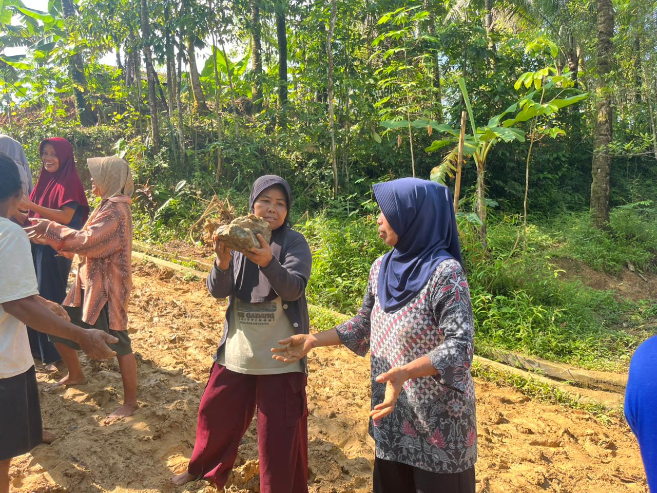 Dalam kegiatan tersebut, ibu-ibu desa turut terlibat memindahkan material secara estafet dari satu titik ke titik pengerjaan.
