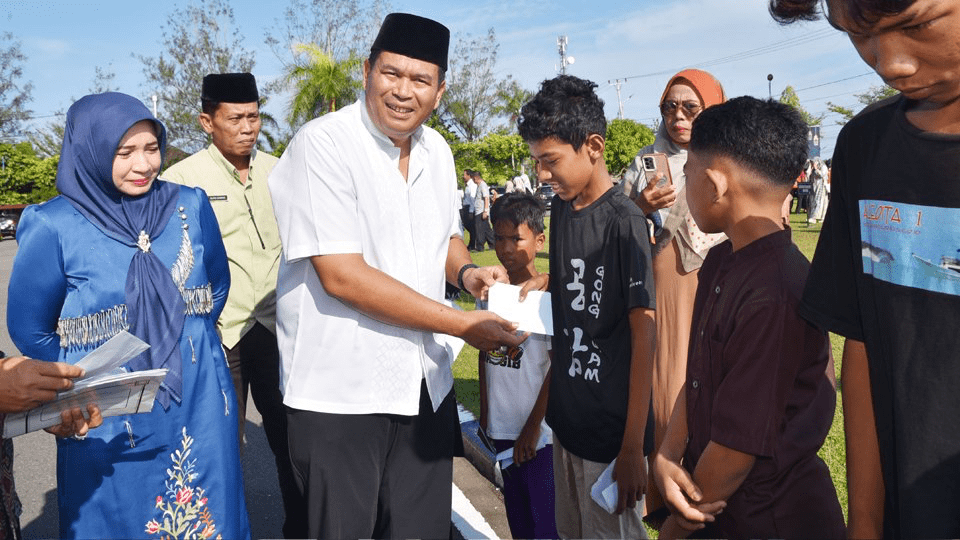 Menjelang Idul Fitri 1447 Hijriah, 450 anak yatim di Kota Pariaman menerima santunan dari Pemko Pariaman, yang disalurkan langsung oleh Wali Kota Pariaman Yota Balad di halaman Balaikota Pariaman usai apel gabungan Aparatur Sipil Negara (ASN), Senin (16/3/2026).