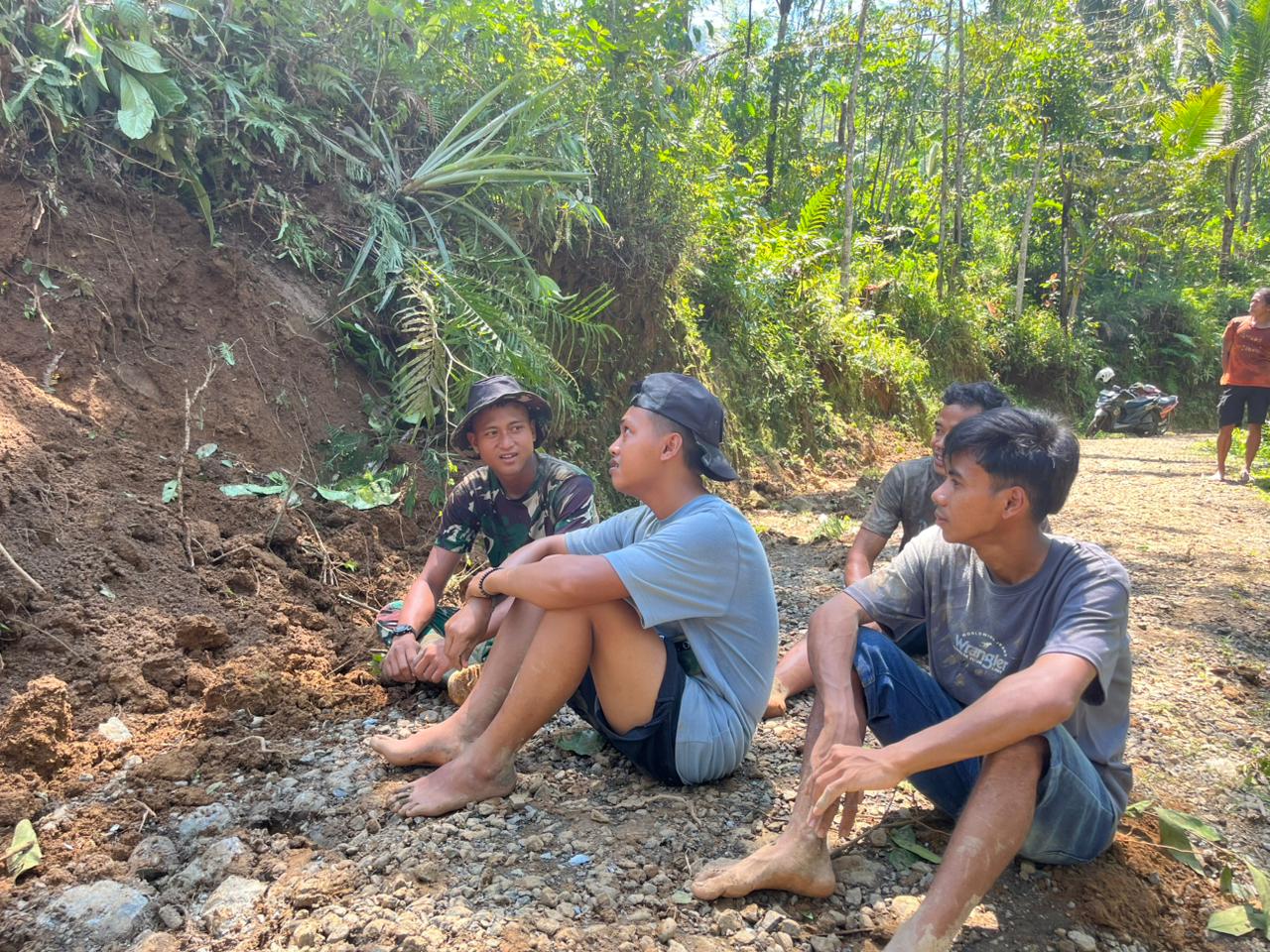 Di sela kegiatan pembangunan jalan, personel TNI dan warga memanfaatkan waktu istirahat dengan duduk bersama di bawah pepohonan di tepi jalan desa.