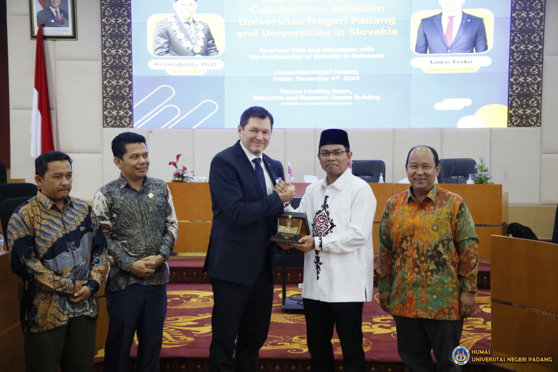 Universitas Negeri Padang (UNP) Jajaki kerjasama dengan Kedutaan Besar (Kedubes) Slovakia pada Jumat (6/12/2024). Diskusi yang digelar di Ruang Sidang Senat Gedung Rektorat itu dipimpin langsung oleh Rektor UNP, Krismadinata, Ph.D bersama Duta Besar Slovakia untuk Indonesia di Jakarta Tomas Ferto.