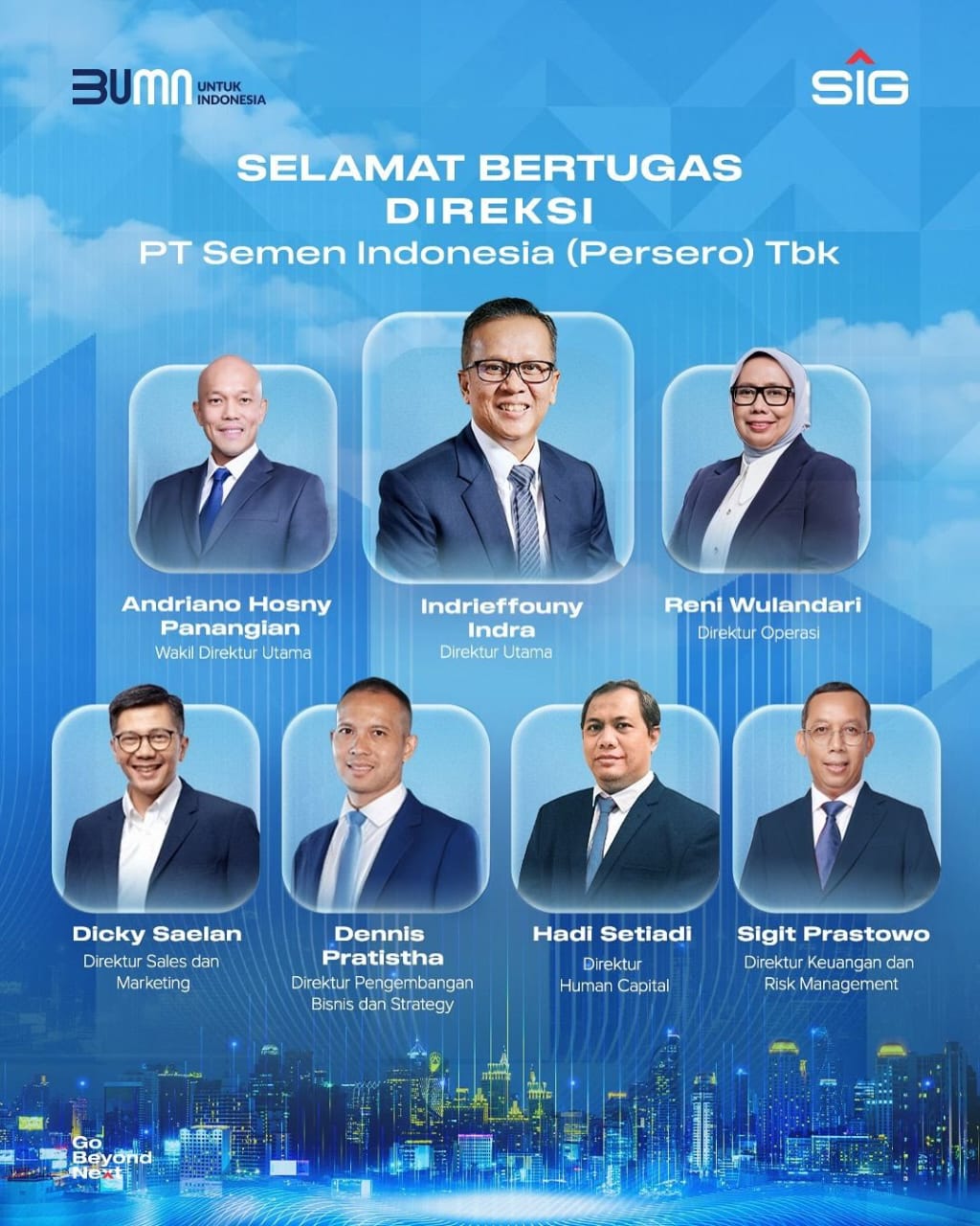 Disampaikan oleh Corporat Secretary SIG Vita Mahreyni, rapat menetapkan susunan Direksi Perseroan, yaitu Direktur Utama dijabat oleh Indrieffouny Indra, Wakil Direktur Utama dijabat oleh Andriano Hosny Panangian, Direktur Sales dan Marketing dijabat oleh Dicky Saelan, Direktur Pengembangan Bisnis dan Strategy dijabat oleh Dennis Pratistha, Direktur Keuangan dan Risk Management dijabat oleh Sigit Prastowo, Direktur Human Capital dijabat oleh Hadi Setiadi, dan Direktur Operasi dijabat oleh Reni Wulandari.