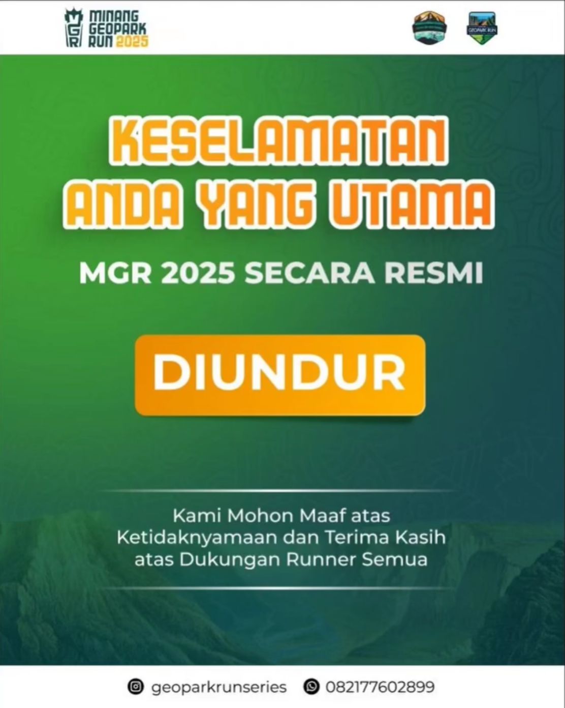 Panitia memastikan, nomor peserta yang telah terdaftar tetap berlaku pada jadwal baru yang akan diumumkan kemudian. Seluruh perkembangan terkait penyelenggaraan Minang Geopark Run 2025 akan diinformasikan melalui kanal resmi @geoparkrunseries.