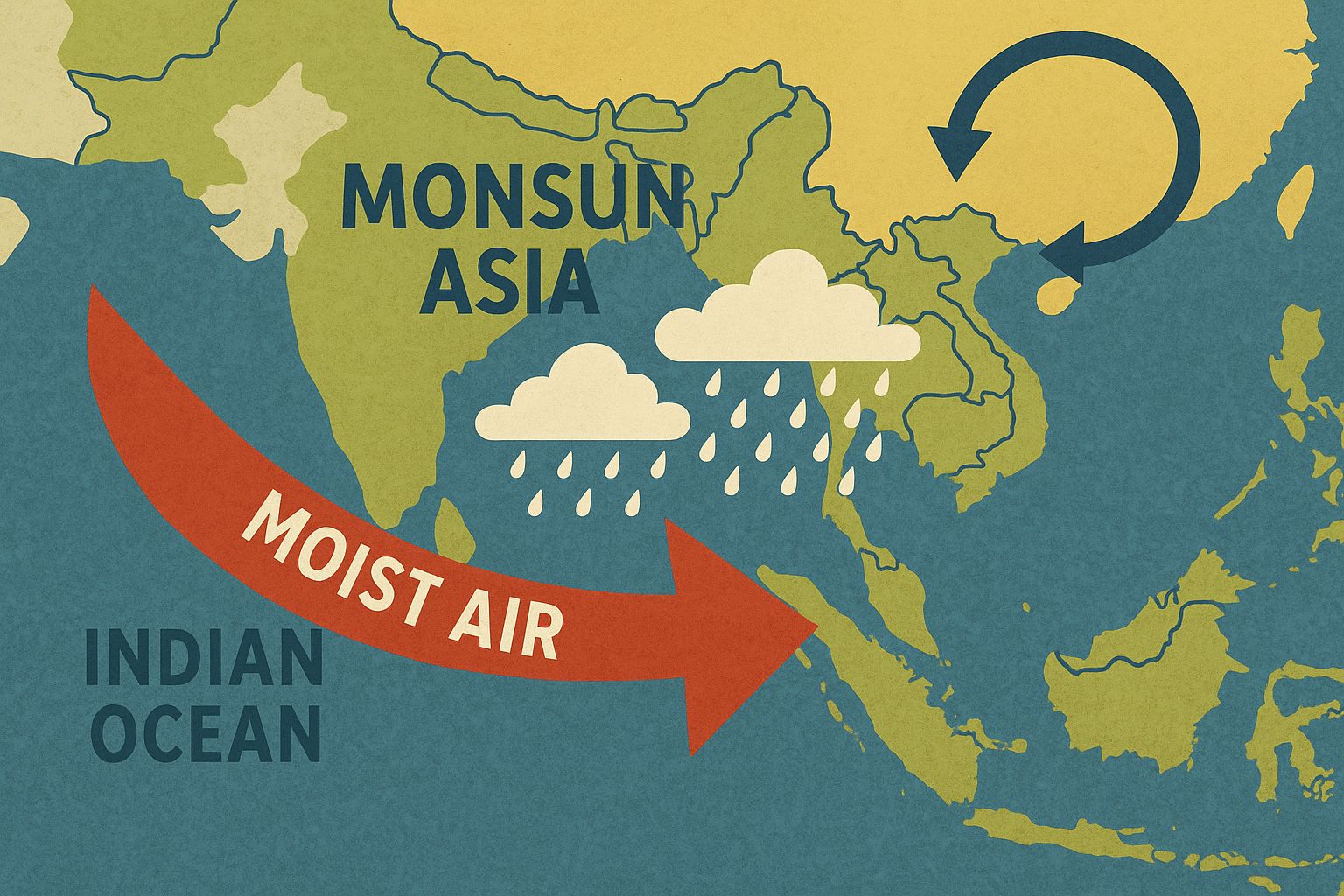Bayangkan Samudra Hindia sebagai lautan luas yang penuh uap air. Lalu bayangkan angin dari Asia sebagai lengan besar yang mengayun, menarik uap itu, dan mendorongnya ke arah khatulistiwa. Itulah gambaran sederhana monsun: perubahan musiman arah angin yang membawa muatan uap air dalam jumlah luar biasa besar.
