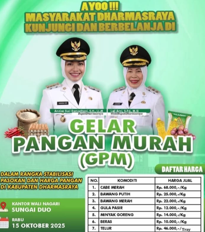 Dalam upaya menekan laju inflasi yang cenderung meningkat dalam beberapa bulan terakhir, Pemerintah Kabupaten Dharmasraya melalui Dinas Pangan dan Perikanan (Dispakan) akan menggelar Gerakan Pangan Murah (GPM) di dua lokasi berbeda pada bulan Oktober ini.