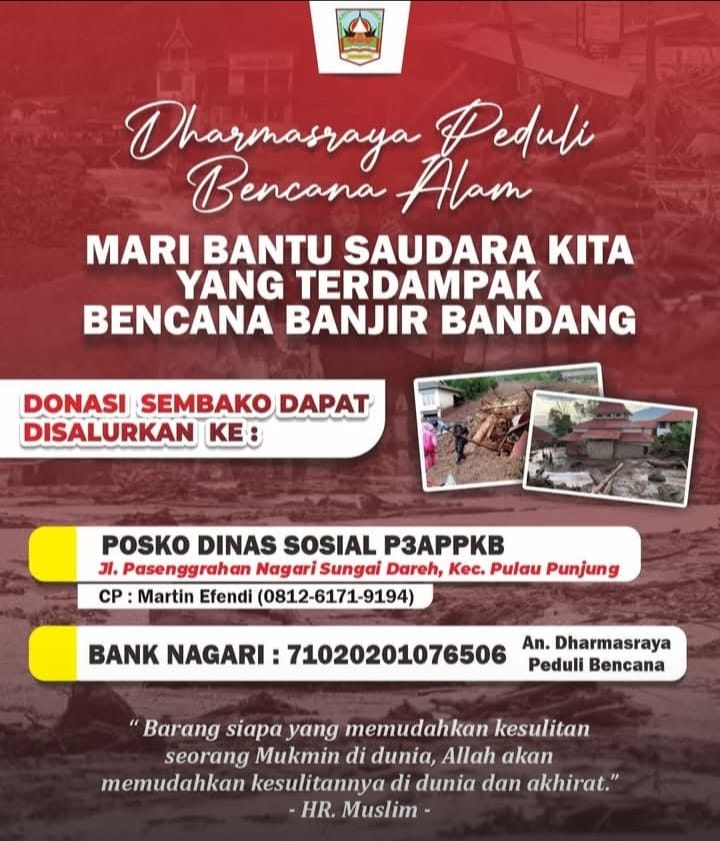 Pemerintah Kabupaten Dharmasraya menggalang bantuan untuk korban banjir bandang yang melanda sejumlah wilayah di Sumatera, khususnya di Provinsi Sumatera Barat. Bupati Dharmasraya Annisa Suci Ramadhani dan Wakil Bupati Leli Arni menyampaikan duka mendalam atas jatuhnya korban jiwa serta besarnya kerusakan akibat bencana tersebut.