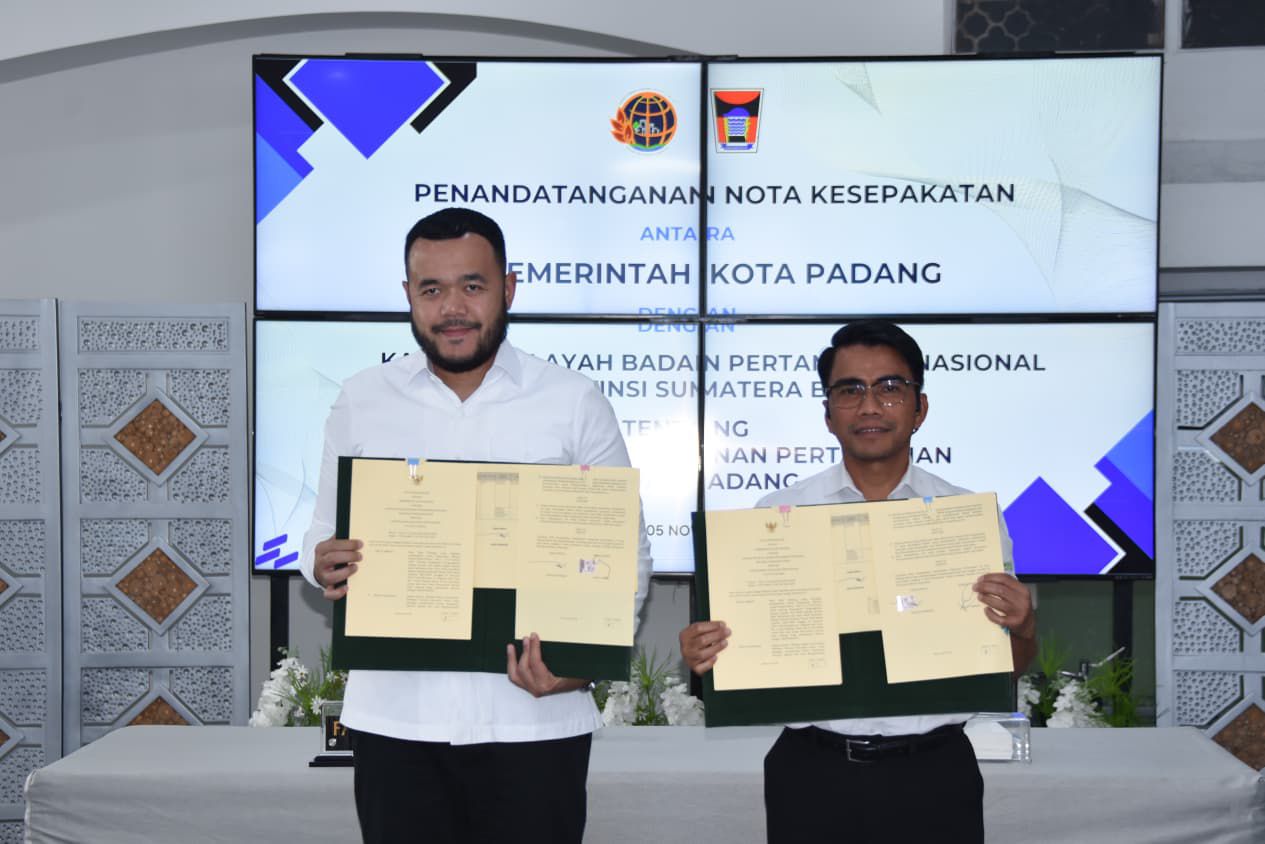 Pemerintah Kota (Pemko) Padang menandatangani Nota Kesepakatan dengan Kantor Wilayah (Kanwil) Badan Pertanahan Nasional (BPN) Provinsi Sumatera Barat (Sumbar) tentang Optimalisasi Pelayanan Pertanahan. Penandatanganan dilakukan oleh Wali Kota Padang Fadly Amran dan Kepala Kanwil BPN Sumbar Teddi Guspriadi di Gedung Putih Rumah Dinas Wali Kota Padang, Rabu (5/11/2025).