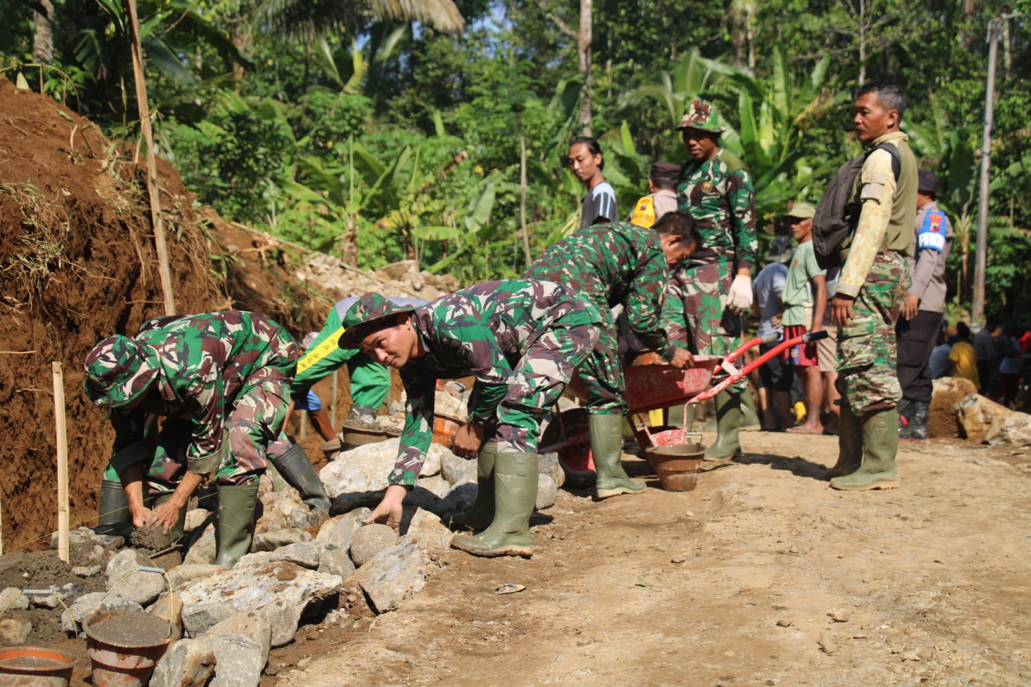 Selain personel TNI, warga setempat juga turut membantu proses pengerjaan melalui kegiatan gotong royong di lokasi pembangunan.