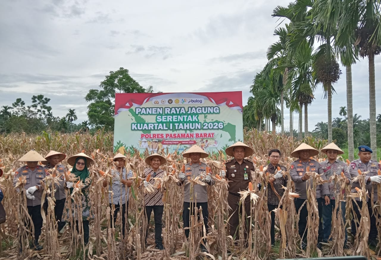 Polres Pasaman Barat bersama unsur Forkopimda menggelar Panen Jagung Serentak Kuartal I Tahun 2026 di lahan pertanian masyarakat Bandarejo, Nagari Lingkuang Aua, Kecamatan Pasaman, Kamis (8/1/2026), sebagai bagian dari dukungan terhadap program Swasembada Pangan.