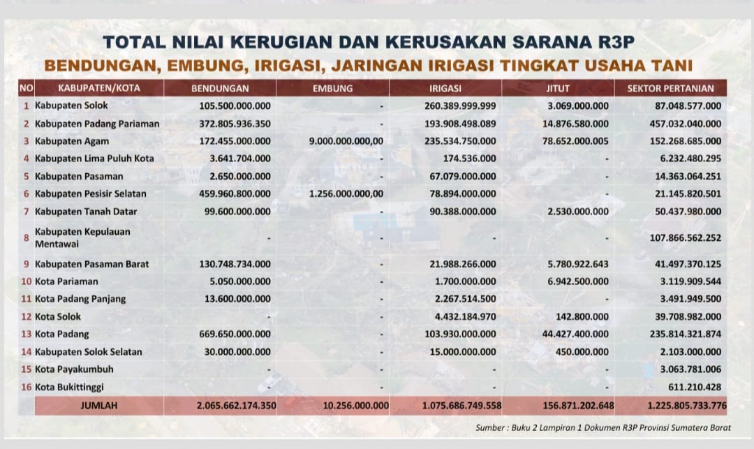 Setelah berkoordinasi langsung dengan Pemerintah Provinsi Sumbar serta pemerintah 19 Kabupaten dan Kota, terungkap total nilai kerugian dan kerusakan sektor pertanian beserta infrastruktur pendukung mencapai sekitar Rp4,53 triliun.