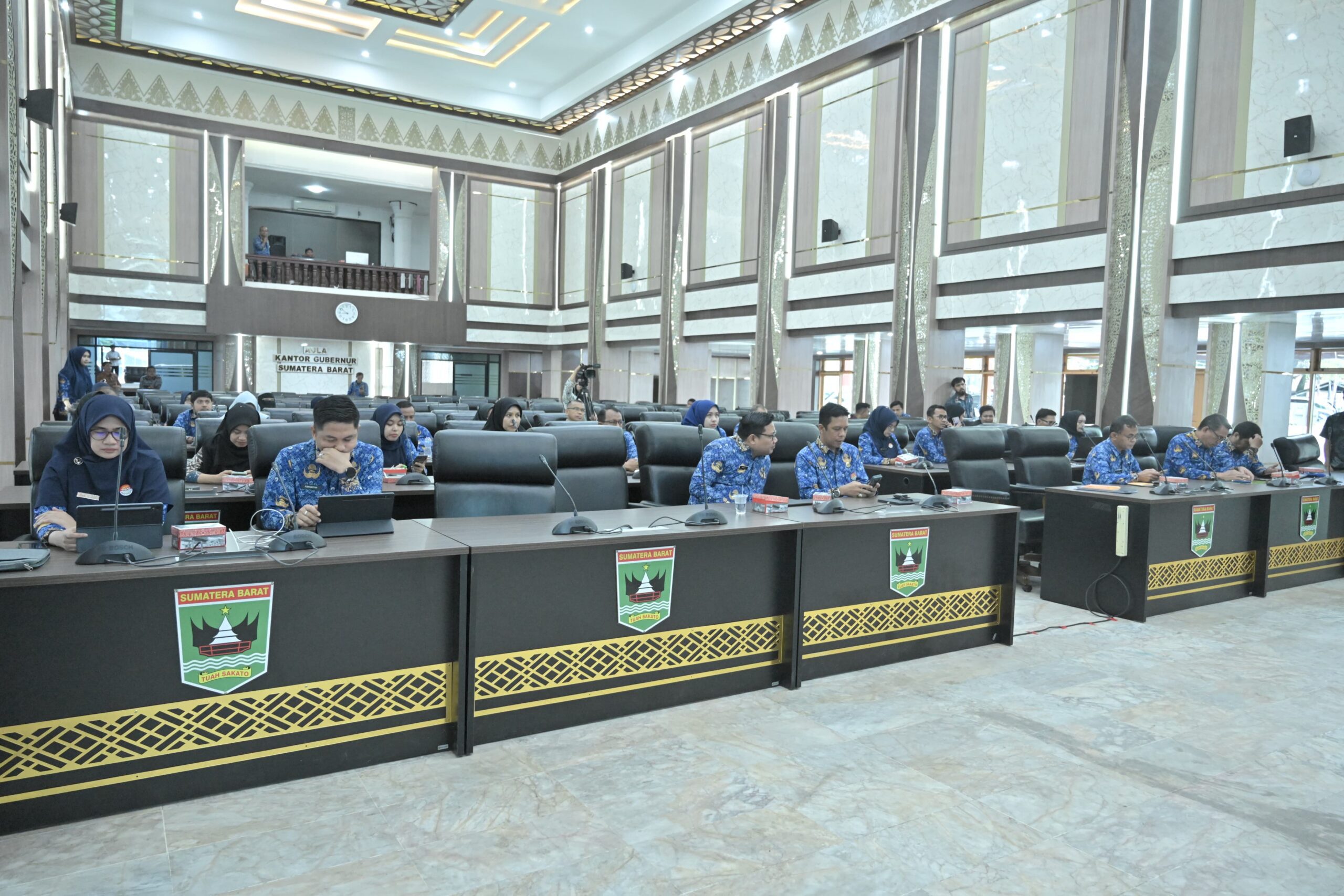 Pj. Sekretaris Daerah Provinsi Sumatera Barat (Sekda Provinsi Sumbar) Yozawardi Usama Putra membuka rapat forum perangkat daerah untuk penajaman Rencana Strategis (Renstra) Sekretariat Daerah Provinsi dan Kabupaten/Kota se-Sumbar, di Aula Kantor Gubernur, Kamis (17/4/2025).