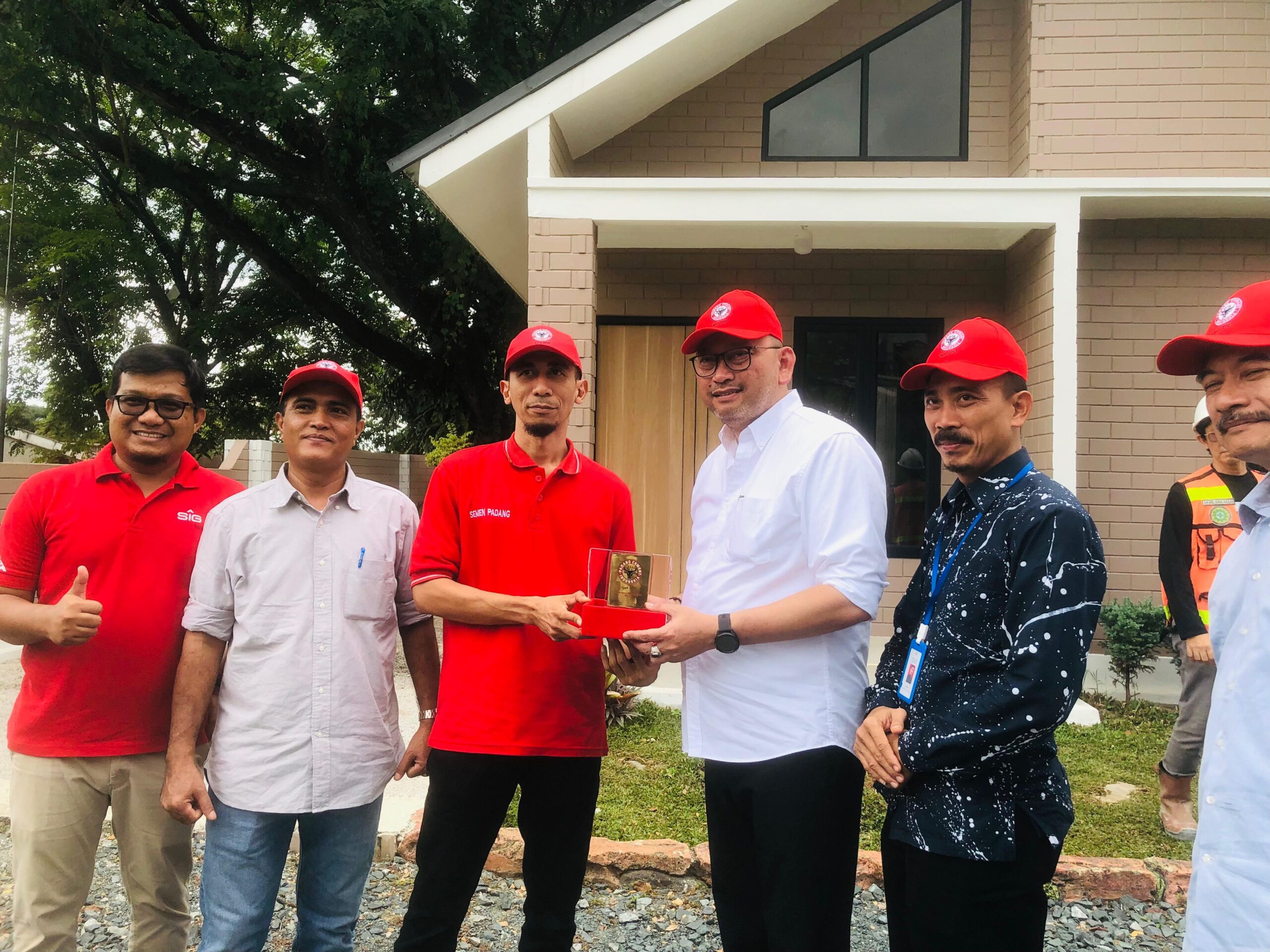 Sekretaris Jenderal Kementerian Sosial Robben Rico meninjau rumah contoh yang dibangun dengan teknologi Semen Padang Bata Interlock (SEPABLOCK) di area PT Semen Padang, Sabtu (15/11/2025). Dalam kunjungan tersebut, Robben menyampaikan kekagumannya terhadap kualitas konstruksi dan efisiensi sistem interlock yang dikembangkan perusahaan.