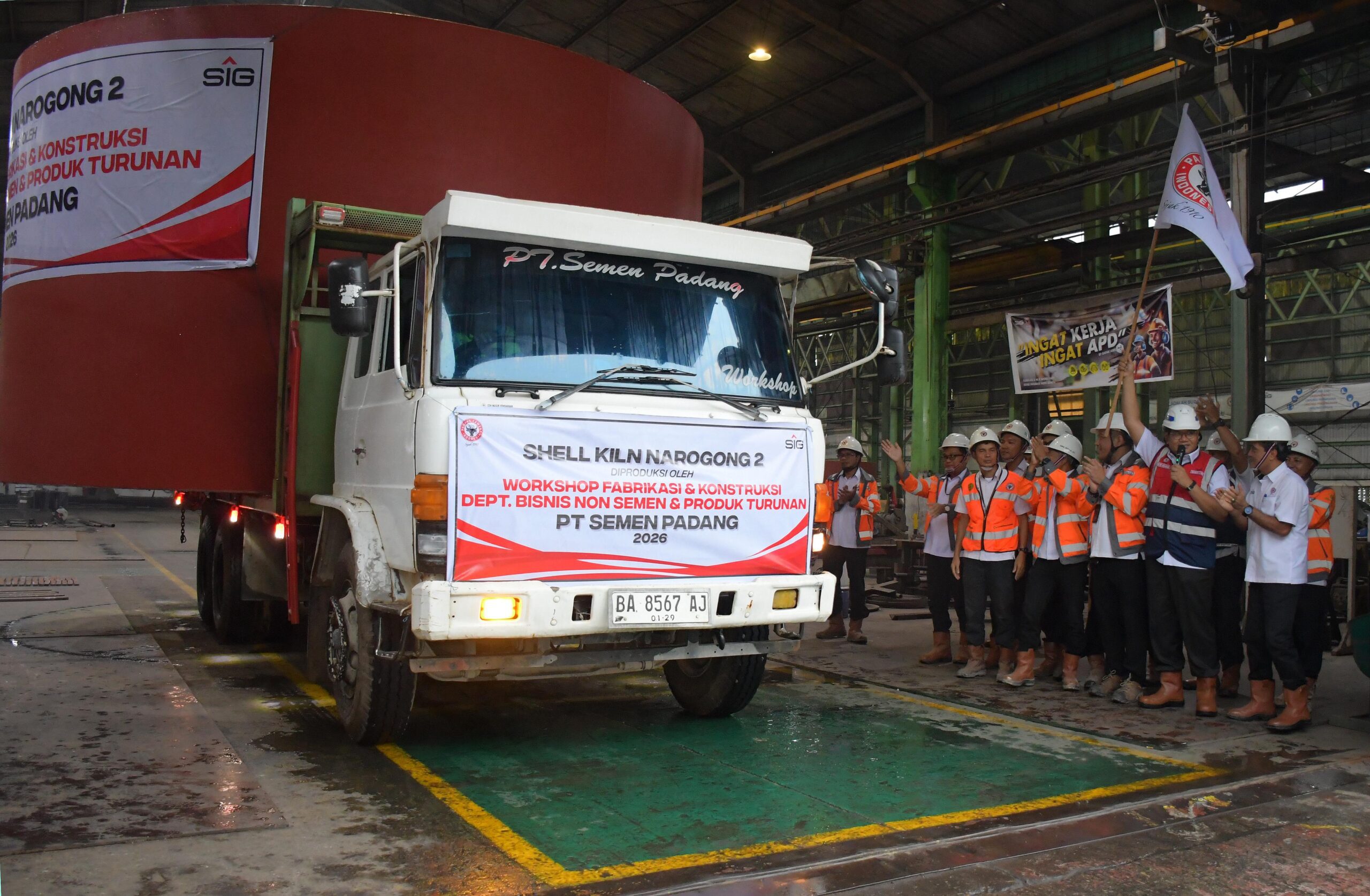 PT Semen Padang kembali menunjukkan kapasitasnya sebagai perusahaan industri terintegrasi melalui pelepasan produk fabrikasi Shell Kiln Narogong 2, pesanan PT Solusi Bangun Indonesia Tbk, di area workshop perusahaan, Senin (30/3/2026).