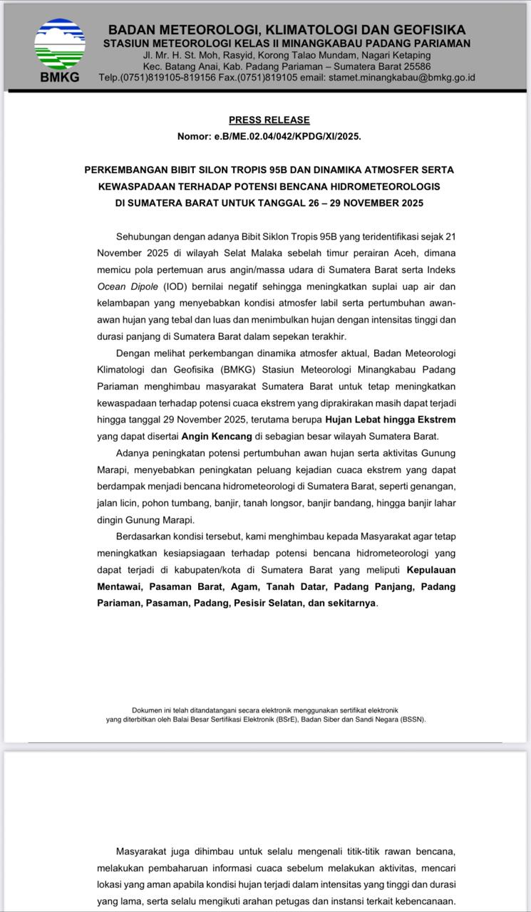 “Dinamika perkembangan terus kita pantau, dan dukungan data dari BMKG masuk secara konsisten. Ternyata, durasi cuaca ekstrem di Sumbar lebih panjang dari perkiraan semula. Karena itu, masyarakat diminta tetap waspada dan mengikuti arahan petugas kebencanaan,” ujar Sekda Arry di Padang, Rabu (26/11/2025).