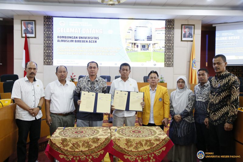Universitas Negeri Padang (UNP) menerima kunjungan benchmarking dari Universitas Almuslim Bireuen, Aceh, pada Selasa (20/5/2025), di Ruang Sidang Senat Lantai 4 Gedung Rektorat dan Research Center UNP. Kegiatan ini dirangkai dengan penandatanganan nota kesepahaman (MoU) antara kedua institusi dalam rangka mempererat kerja sama dan penguatan sistem penjaminan mutu pendidikan tinggi.