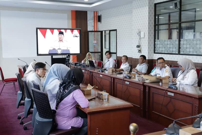 Wali Kota Pariaman Yota Balad, bersama Wakil Wali Kota Mulyadi mengikuti peluncuran logo dan tema Hari Ulang Tahun (HUT) ke-80 Kemerdekaan Republik Indonesia Tahun 2025 secara virtual, di Ruang Rapat Wali Kota Pariaman, yang disampaikan langsung oleh Presiden RI Prabowo Subianto dari Istana Negara, Rabu (23/7/2025) sore.